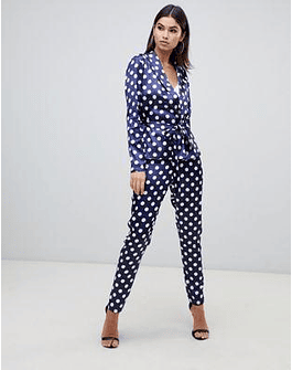 Boohoo satin tapered pants in navy polka dot