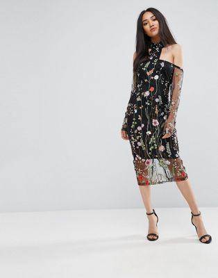 AX Paris T-Bar Long Sleeve Embroidered Floral Choker Dress With 3/4 Mesh Sleeves