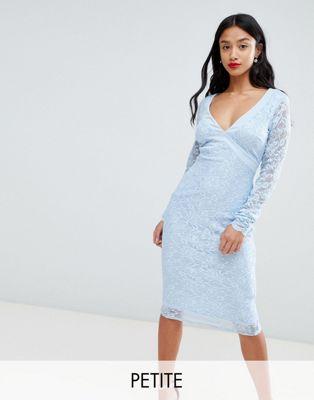 Petite dress by City Goddess Petite Be the best-dressed guest V-neck Lace sleeves and back Sheer delight Tie fastening Open back Close-cut bodycon fit