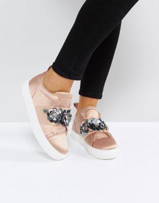 Satin-style upper Bead and sequin embellishment Padded for comfort Pull tab Contrast sole