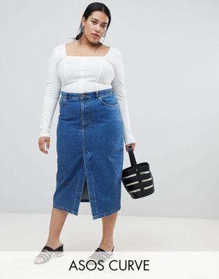 DESIGN Curve denim midi skirt with split front in midwash blue