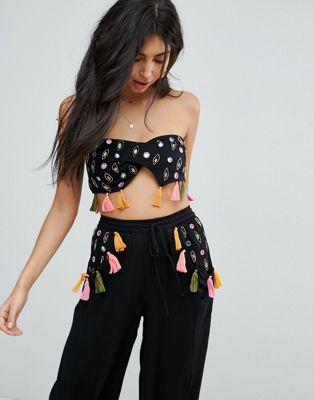 Lightweight woven fabric Embellished front Bandeau neck Strapless design Tassel edge Cropped length Slim fit - cut close to the body