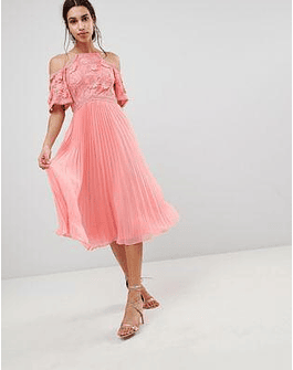 DESIGN Guipure Lace Top Midi Dress With Pleated Skirt