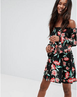 Shirred Bardot Mini Dress With Trumpet Sleeve In Floral Print