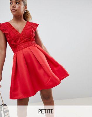 Little Mistress Petite frilly lace mini skater prom dress in pomegranate