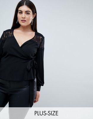 Outrageous Fortune Plus ruffle detail lace insert wrap blouse