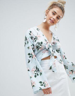 PrettyLittleThing Floral Tie Front Crop Blouse
