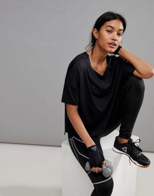 Stretch ACTIVCHILL fabric Features enhanced breathability Designed to keep you cool and dry Scoop neck Looser than your average crew Dropped shoulders Reebok logo detail Perforated back Regular cut Fits you just right
