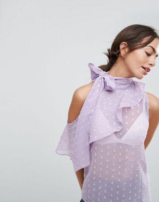Sheer lightweight fabric High neck with bow Ruffle cold-shoulder detail Stepped hem Regular fit - true to size Machine wash 100% Polyester Our model wears a UK 8/EU 36/US 4 and is 173cm/5'8" tall