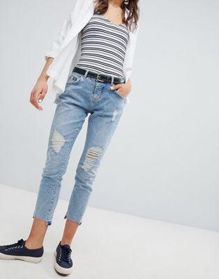 Another pair to add to the collection Mid-rise waist Concealed fly Five pockets Ripped details Crop legs Raw hem Girlfriend fit What’s hers is yours