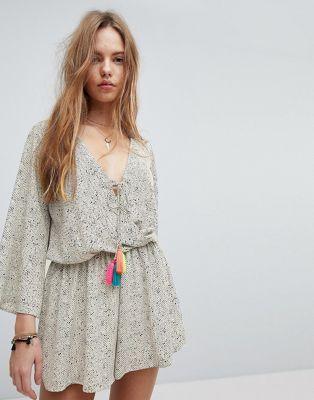 Who else is feeling that summer state of mind? Pattern design A shot of print perfection V-neck Cross-over front That's a wrap Tie fastening Tassel detail Flared sleeves Stretch waist Relaxed fit Loose but not oversized