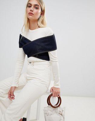 Do your denim differently Off-the-shoulder design Crossover front Hook-and-eye closure Cropped length Regular fit - true to size